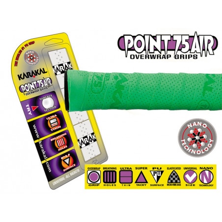 La poignée de surenveloppe Karakal Point 75 Air est légèrement plus épaisse que les autres overgrip avec une épaisseur de 0,75 mm, et une surface collante avec des trous de respiration pour une prise en main fraîche.