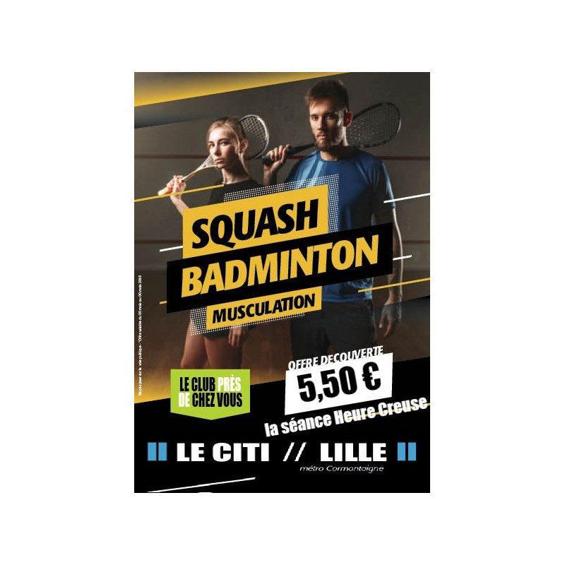 La réservation en squash ou en Badminton d'un terrain en Heures creuses. Pour 2 personnes (voire 4 en Badminton). 40 minutes en squash ou Badminton. Ou encore Deux entrées individuelles pour le squash, le badminton et aussi l'atelier musculation. Valable également pour le PING PONG .