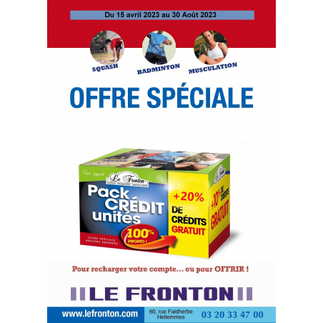 - + de 20% de recharge d'unités offertes .Soit en Squash ou badminton la séance heures creuses à 5.00 € au lieu de 8€ au passage et/ou 6.5 € en heures pleines au lieu de 9€ au passage voir "Description" sur nombre de credits par activités et selon horaire.